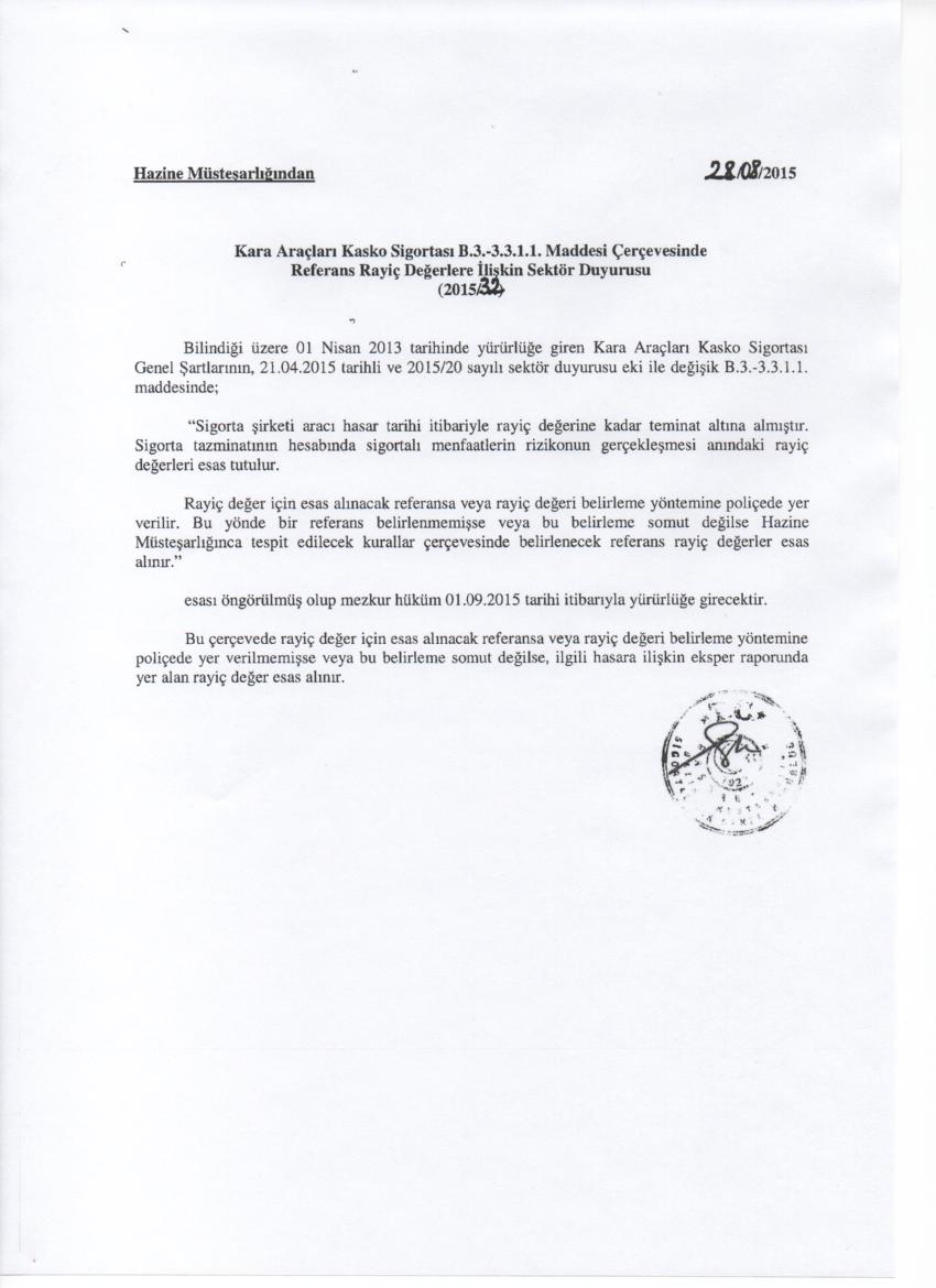 Hazine Müsteşarlığı tarafından yayınlanan, 28.08.2015 tarihli ve 2015/32 sayılı Kara Araçları Kasko Sigortası B.3.-3.3.1.1 Maddesi Referans Rayiç Değere İlişkin Sektör Duyurusu Ek’ bilgilerinize sunulmuştur.